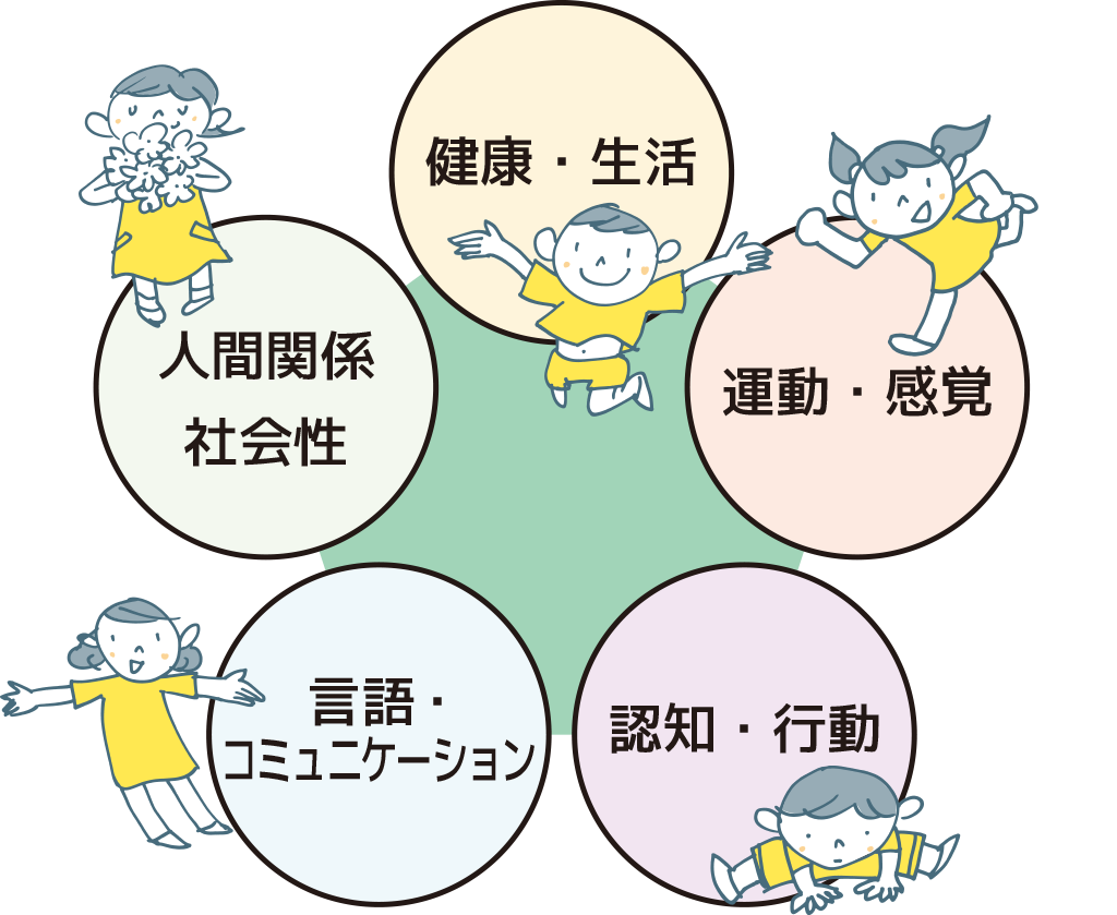 neo kisは、厚⽣労働省の定める児童発達⽀援ガイドラインに基づいて、「健康・生活」「運動・感覚」「認知・行動」「言語・コミュニケーション」「人間関係・社会性」の5つの領域から総合的にアプローチし、支援します。